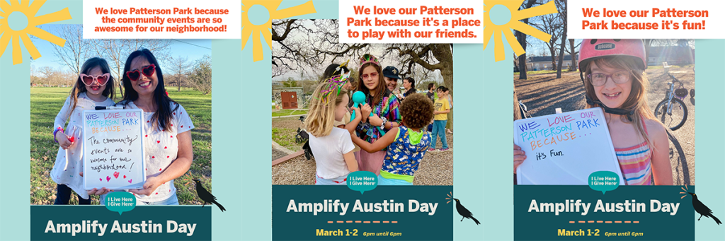 Thanks to the generosity of our neighbors, sponsors, and Austin Parks Foundation, Friends of Patterson Park raised an amazing $9,776 during our 2023 Amplify Austin campaign. We pooled the support of 58 individual donors, eight sponsors totaling $6,276, in-kind donations by Worley Printing, and a $3,500 match from Austin Parks Foundation for a final total of $9,776 raised. This funding will support our mission of building a stronger community and making our park a more welcoming place for ALL! Thank you, friends and neighbors!