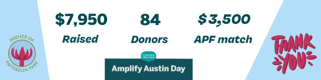 Thanks to the generosity of our neighbors, sponsors, and Austin Parks Foundation, Friends of Patterson Park raised an astounding $11,450 during our 2024 Amplify Austin campaign. We pooled the support of 78 individual donors, six sponsors, an in-kind donation of a petting zoo at our Amplify party by Tiny Tails, and a $3,500 match from Austin Parks Foundation. This funding will support our mission of building a stronger community and making our park a more welcoming place for ALL! Thank you, friends and neighbors!